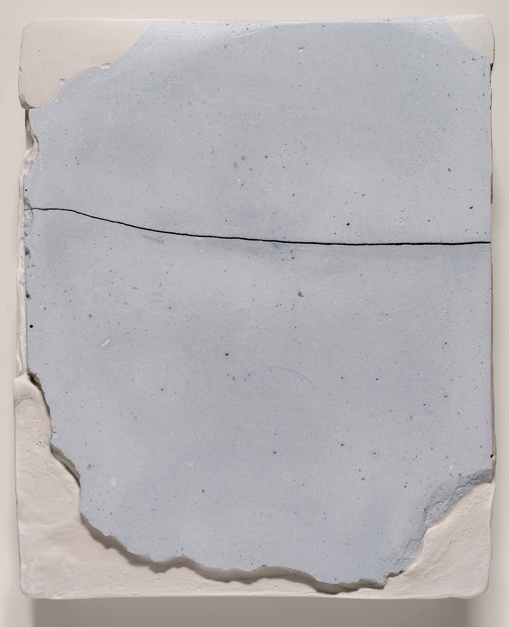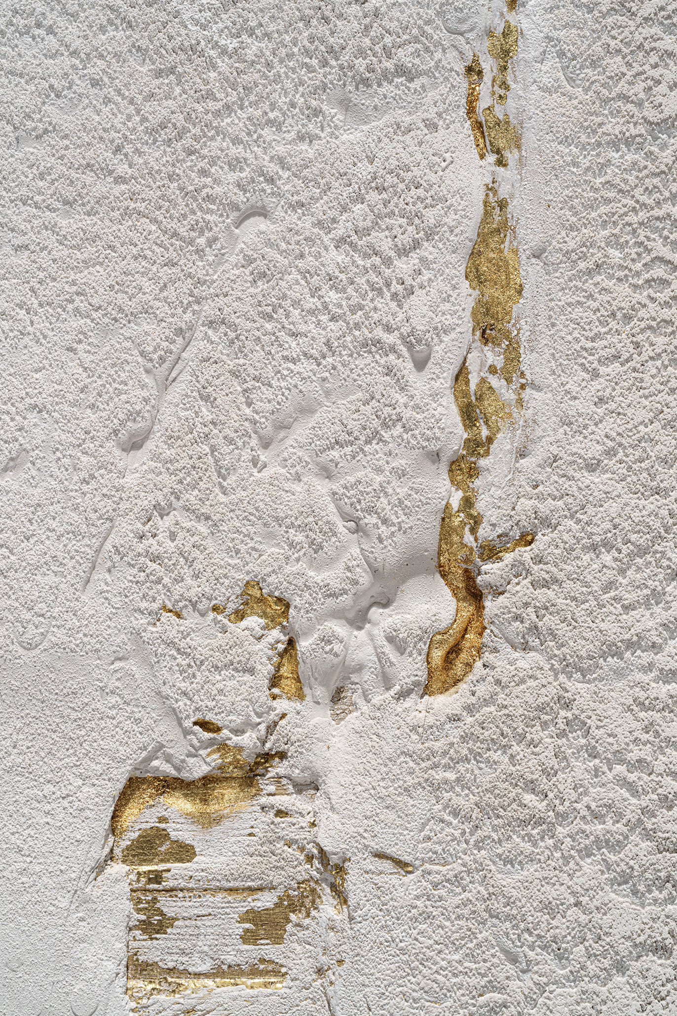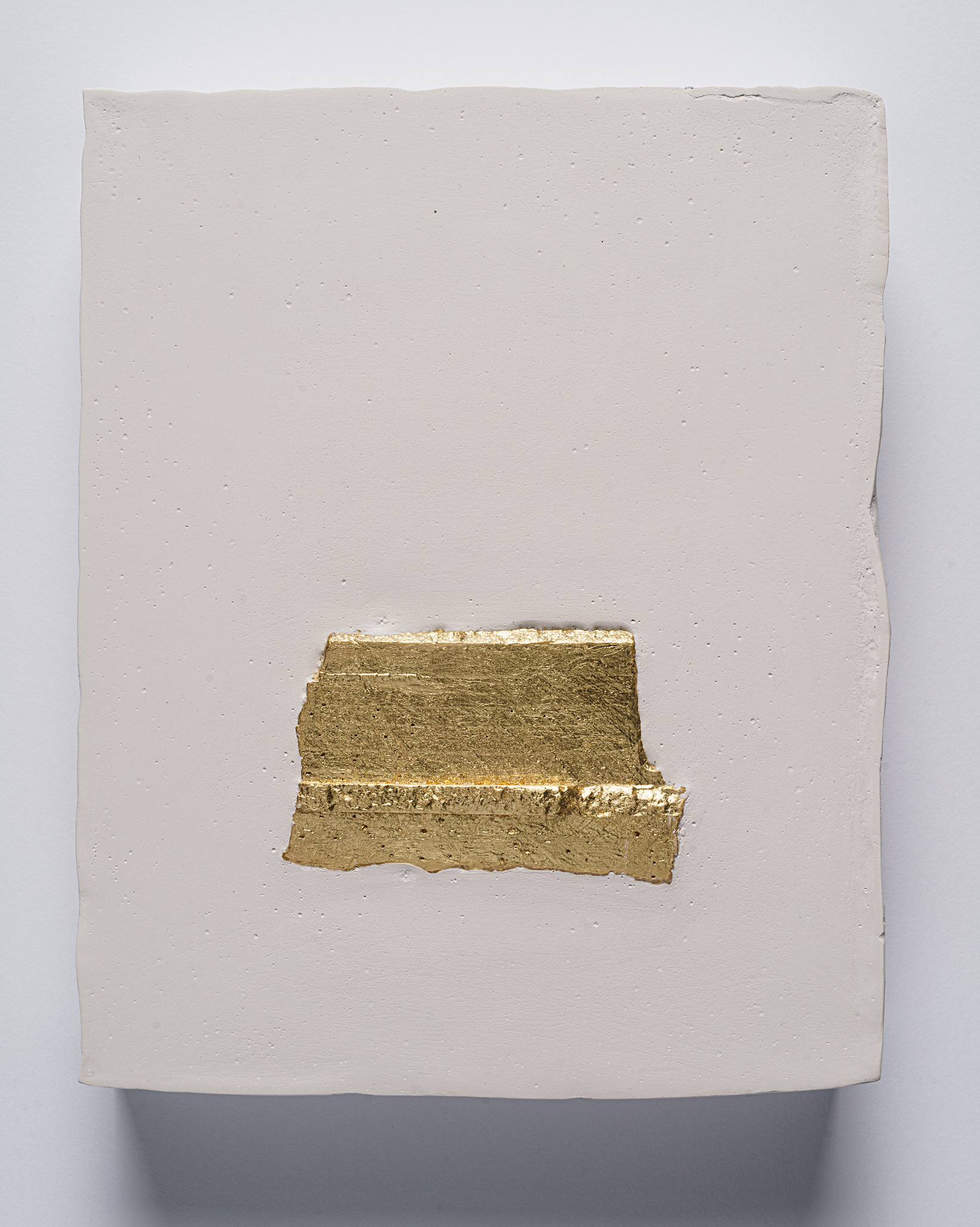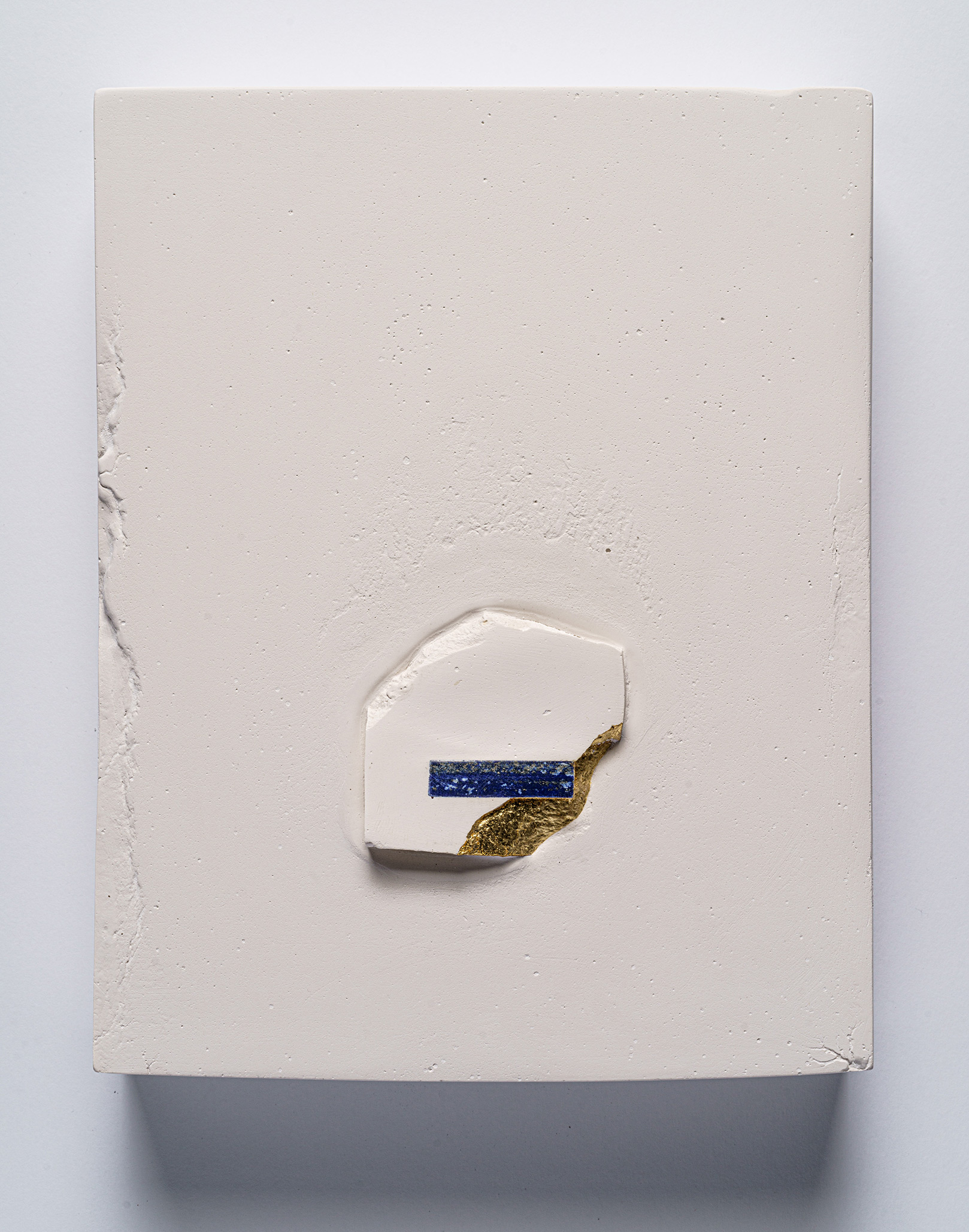 Nunu Fine Art New York is pleased to present Weightless, Jill Downen’s first solo exhibition with the gallery, with works spanning six years of the artist’s career. The exhibition will feature over thirty wall-hanging plaster and concrete works that Downen refers to as “reimagined drawings.” Refined by decades of work with large-scale sculptural installations, Downen’s ‘drawings’ echo their architectural interventions through a reduced and sophisticated color palette, unconventional techniques, and their seasoned skills with plaster, concrete, lapis lazuli, and gold leaf. Each artwork is made with lath-and-plaster or metal mesh and concrete, evoking the traditional wall construction methods with common building materials. This reference to building alludes to Downen’s longstanding interest in architectural spaces and their psychological nature. A critical event in their formative years, a lightning strike to the family home, imprinted a heightened awareness of the body, architecture, and temporality that would, in time, inform the core of their artistic practice. Downen mines their own emotional capacities to draw out the materials’ potential, resulting in unique plaster textures and smooth concrete surfaces interrupted by discerning lapis lazuli inlays and gold-leafed contours emerging from the grayish-whitish ground base.