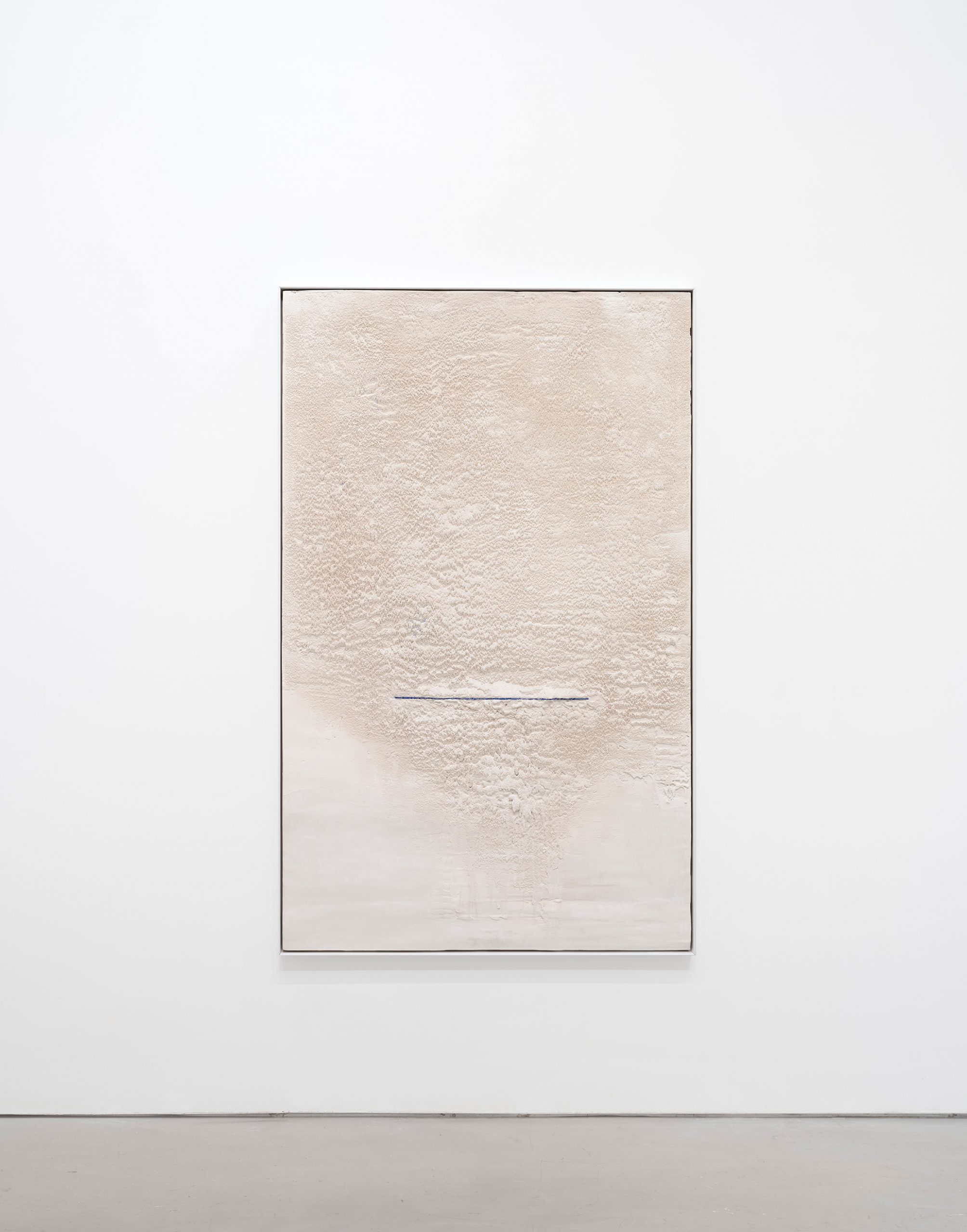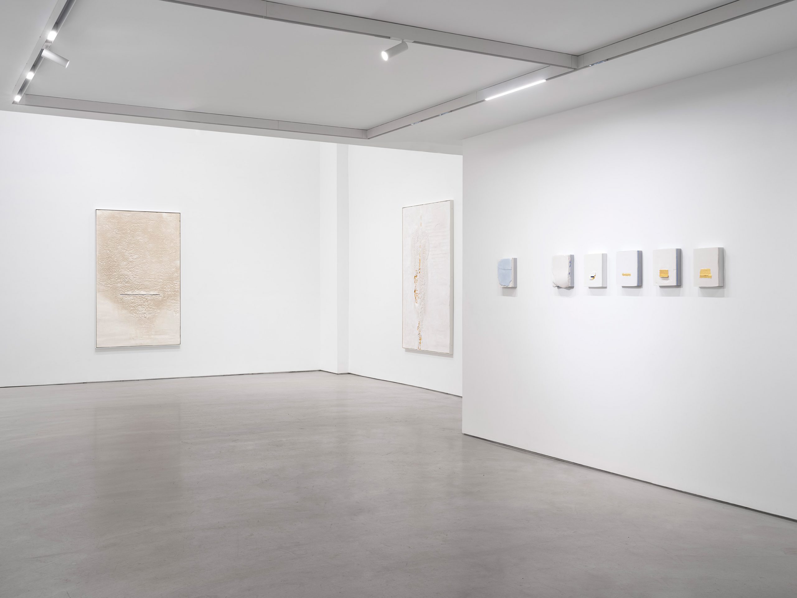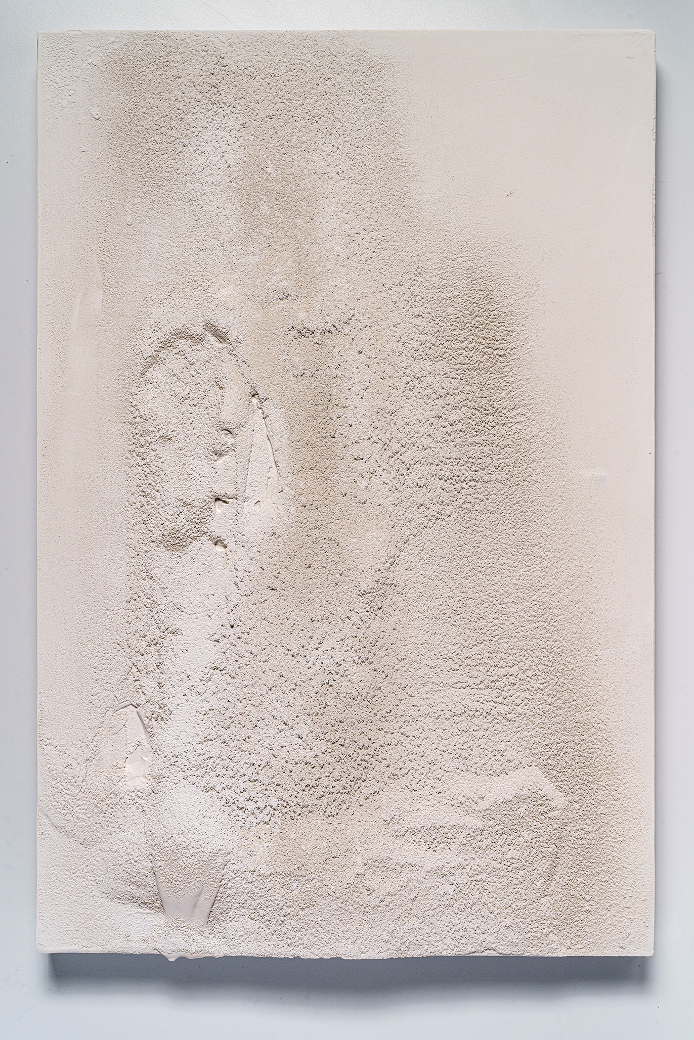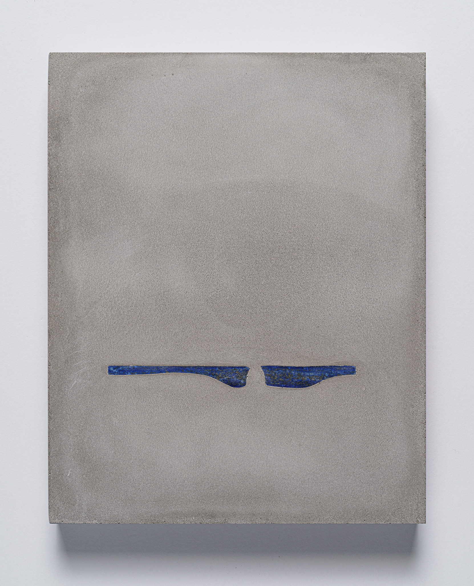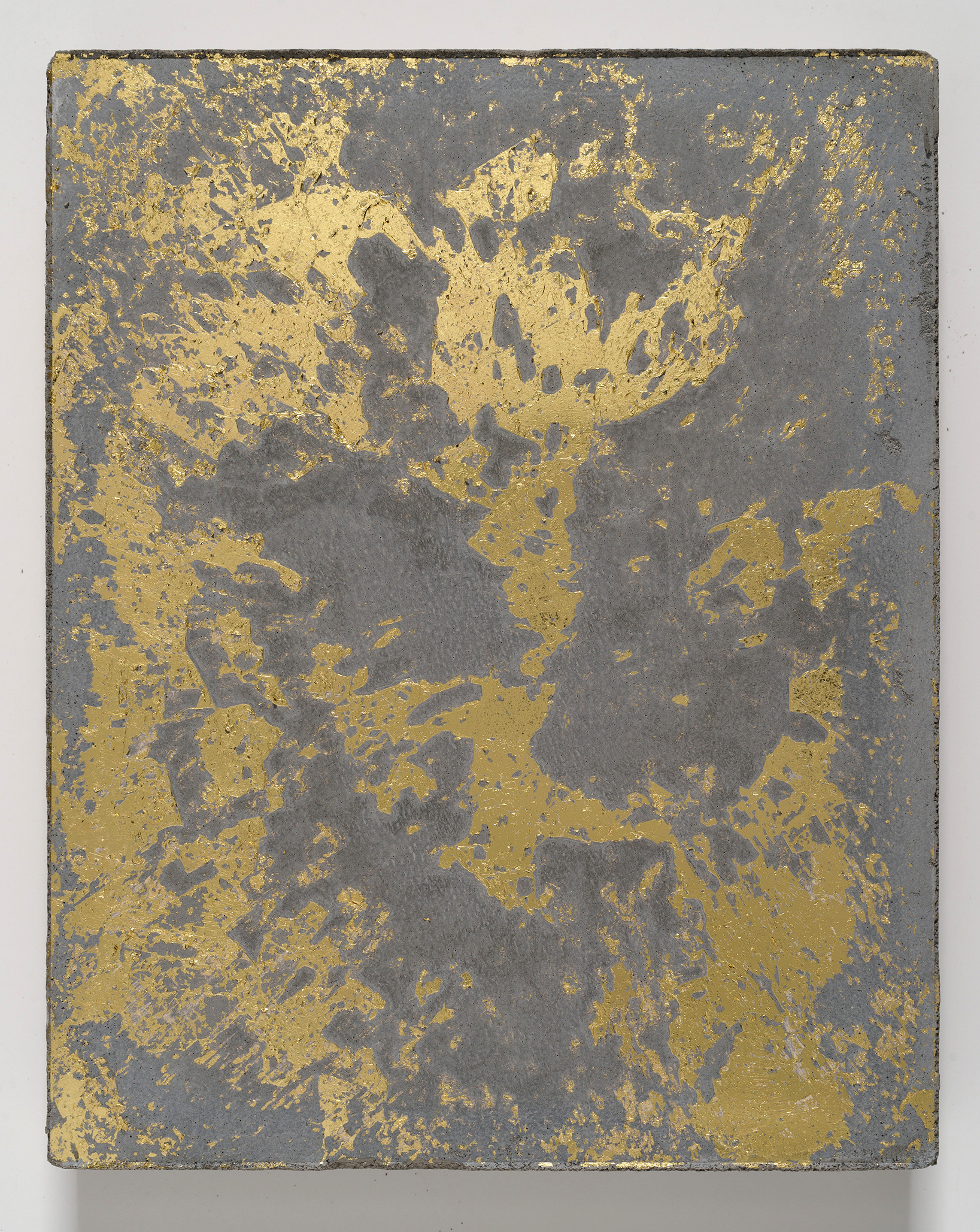 Nunu Fine Art New York is pleased to present Weightless, Jill Downen’s first solo exhibition with the gallery, with works spanning six years of the artist’s career. The exhibition will feature over thirty wall-hanging plaster and concrete works that Downen refers to as “reimagined drawings.” Refined by decades of work with large-scale sculptural installations, Downen’s ‘drawings’ echo their architectural interventions through a reduced and sophisticated color palette, unconventional techniques, and their seasoned skills with plaster, concrete, lapis lazuli, and gold leaf. Each artwork is made with lath-and-plaster or metal mesh and concrete, evoking the traditional wall construction methods with common building materials. This reference to building alludes to Downen’s longstanding interest in architectural spaces and their psychological nature. A critical event in their formative years, a lightning strike to the family home, imprinted a heightened awareness of the body, architecture, and temporality that would, in time, inform the core of their artistic practice. Downen mines their own emotional capacities to draw out the materials’ potential, resulting in unique plaster textures and smooth concrete surfaces interrupted by discerning lapis lazuli inlays and gold-leafed contours emerging from the grayish-whitish ground base.