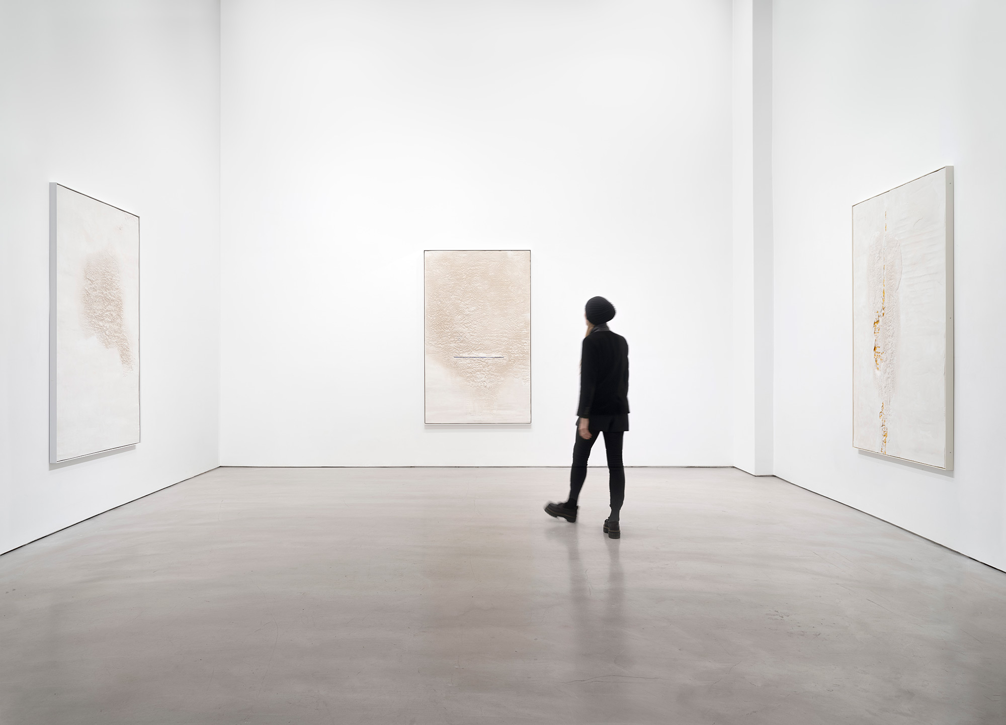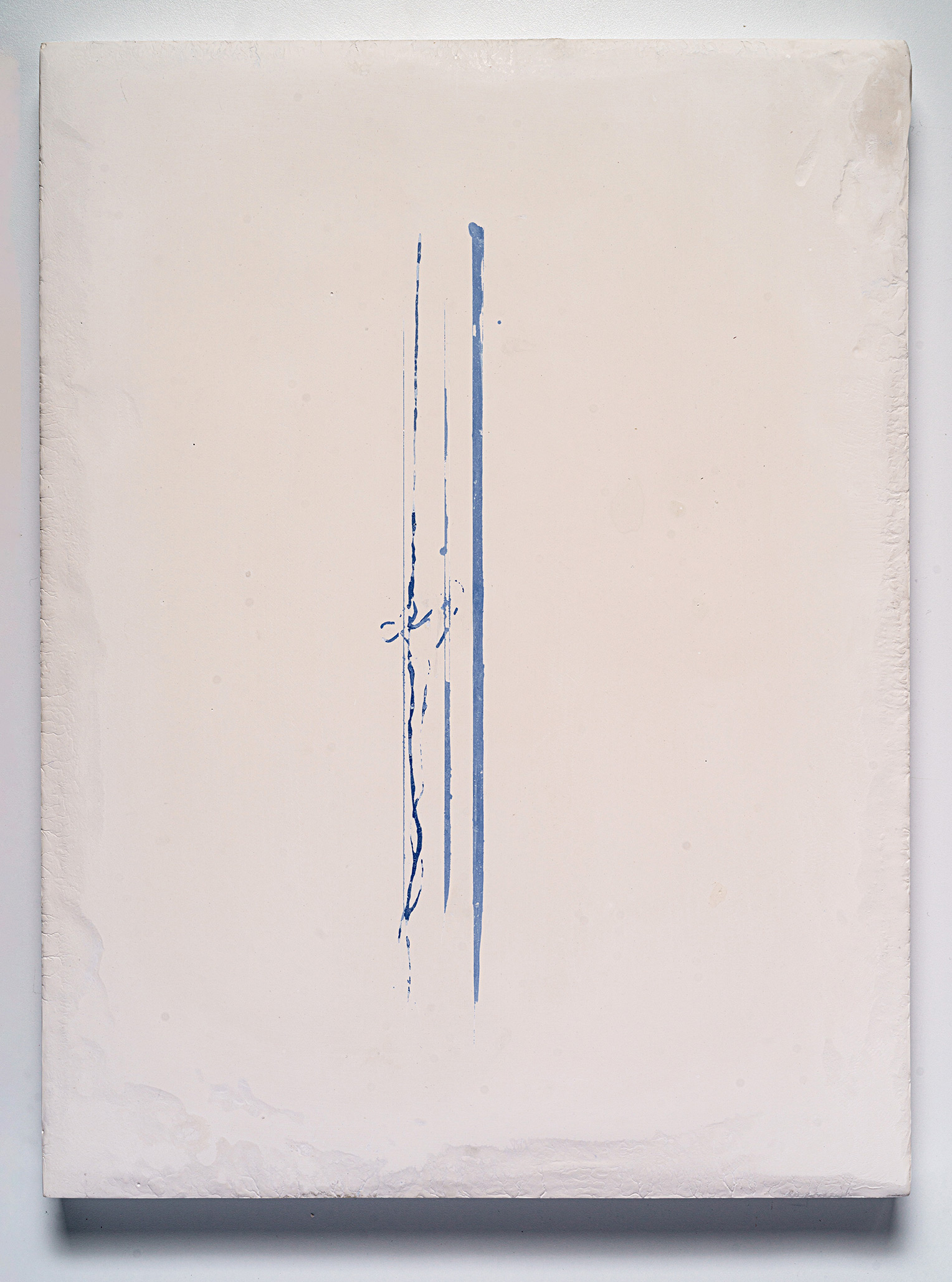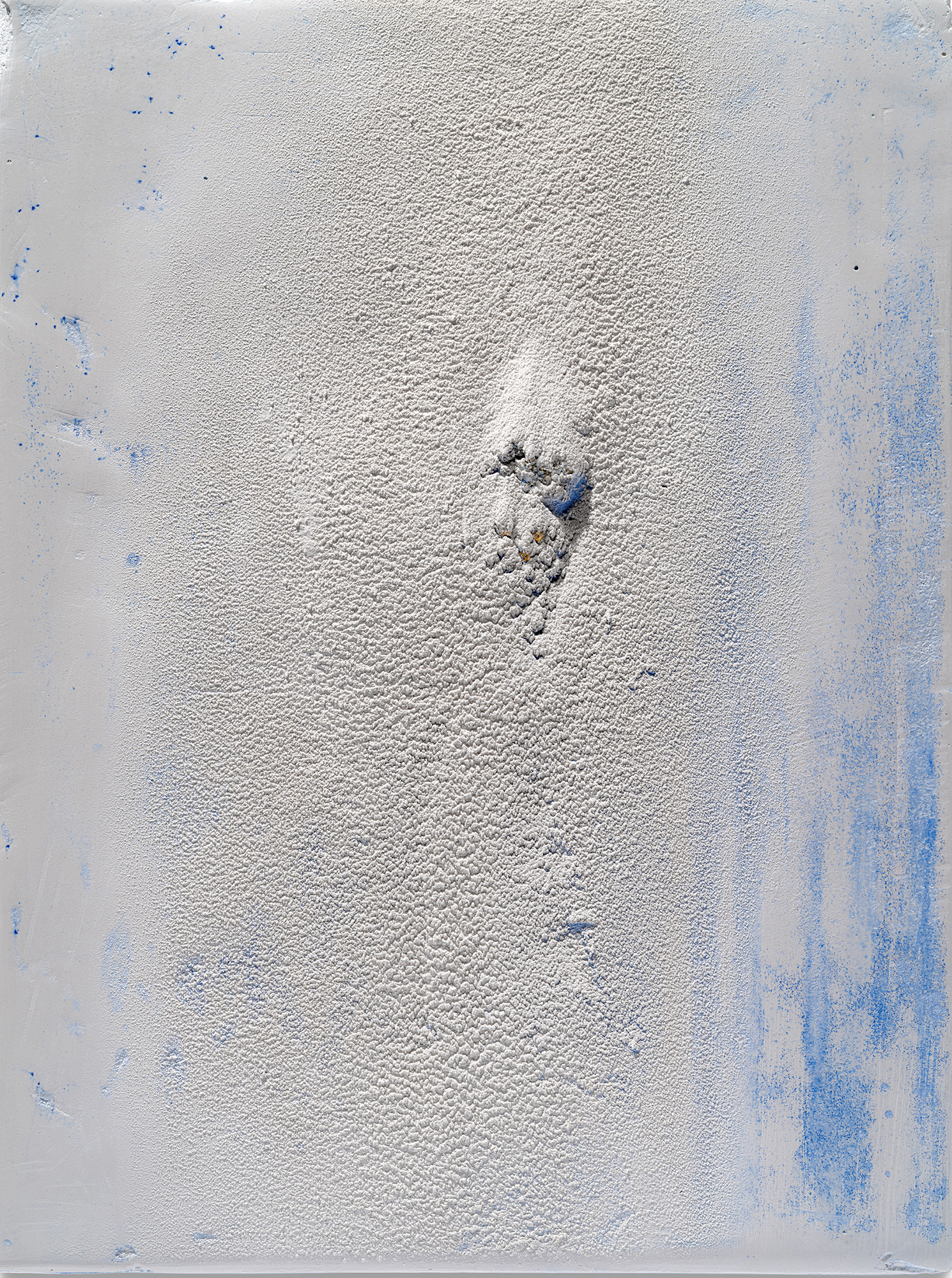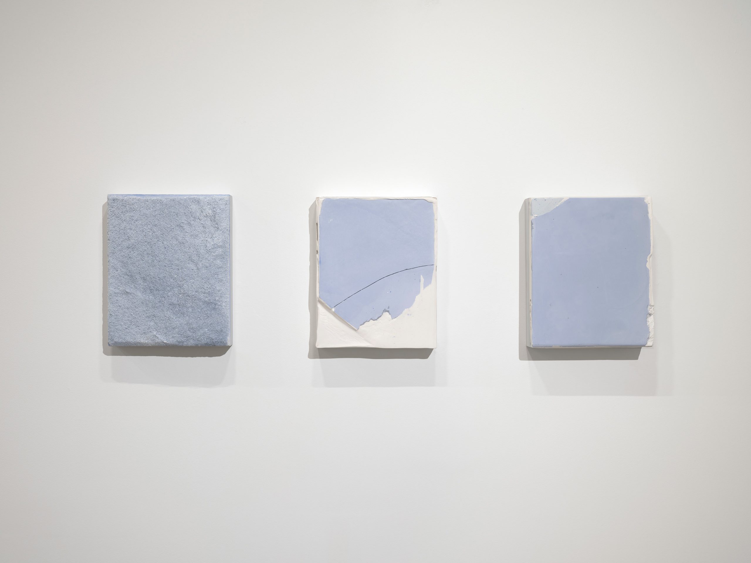 Nunu Fine Art New York is pleased to present Weightless, Jill Downen’s first solo exhibition with the gallery, with works spanning six years of the artist’s career. The exhibition will feature over thirty wall-hanging plaster and concrete works that Downen refers to as “reimagined drawings.” Refined by decades of work with large-scale sculptural installations, Downen’s ‘drawings’ echo their architectural interventions through a reduced and sophisticated color palette, unconventional techniques, and their seasoned skills with plaster, concrete, lapis lazuli, and gold leaf. Each artwork is made with lath-and-plaster or metal mesh and concrete, evoking the traditional wall construction methods with common building materials. This reference to building alludes to Downen’s longstanding interest in architectural spaces and their psychological nature. A critical event in their formative years, a lightning strike to the family home, imprinted a heightened awareness of the body, architecture, and temporality that would, in time, inform the core of their artistic practice. Downen mines their own emotional capacities to draw out the materials’ potential, resulting in unique plaster textures and smooth concrete surfaces interrupted by discerning lapis lazuli inlays and gold-leafed contours emerging from the grayish-whitish ground base.
